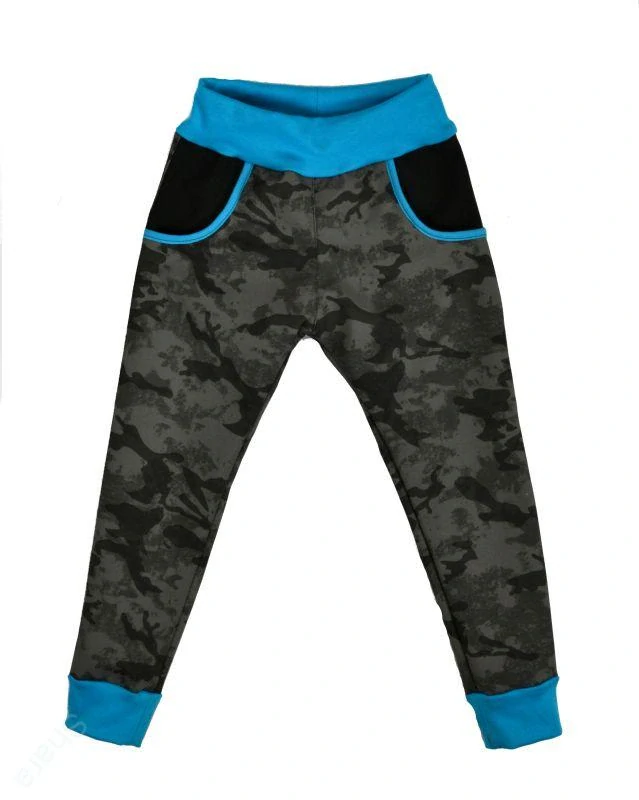 - Dětské kalhoty softshellové šedý maskáč s modrou