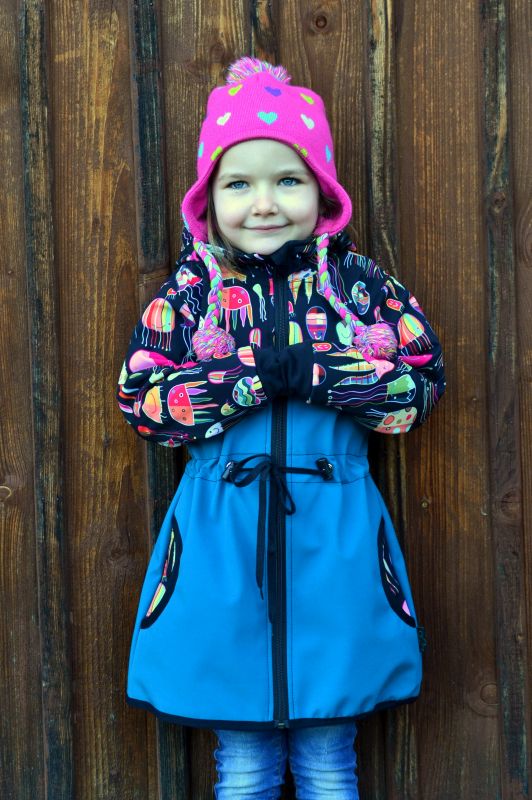 Kabátek si přeje každá holčička, je nápaditý, praktický a s dívkou poroste. Ochrání ji v nepříznivém počasí a oslní když půjde do divadla. Střih je prodloužený, v pase guma, reflexní prvek, kapuce i délka je s gumičkou. Materiál softshell 10/3 spodní strana fleece + jarní podšívka 50%PES 50%VISKOZA